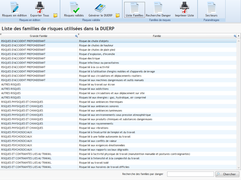 Chaque groupe est subdivisé en sous-groupes afin de mieux définir le risque. Le logiciel répertorie plus de 30 familles de risques.